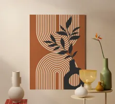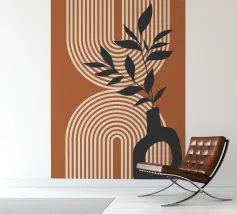 Un design minimalista presenta la silhouette nera di un vaso con foglie su uno sfondo arancione, con linee bianche concentriche. Il layout astratto combina elementi naturali e geometrici per un look armonioso.