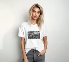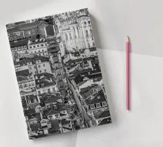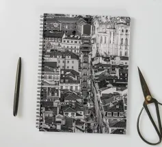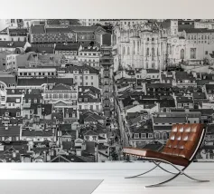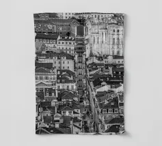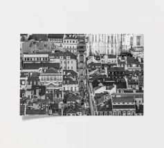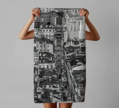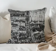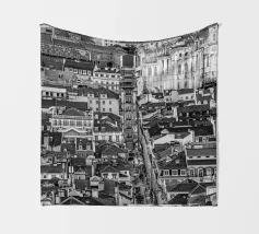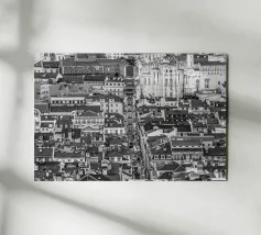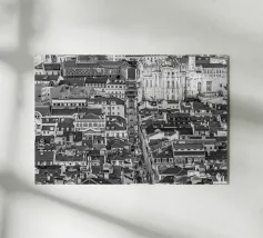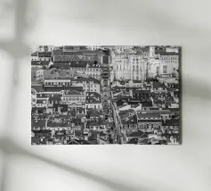 Un'affascinante visione del panorama in bianco e nero di Lisbona, che cattura l'imponente architettura e le affascinanti strade del centro storico. L'Elevador de Santa Justa collega i quartieri Baixa e Bairro Alto e caratterizza il paesaggio urbano.