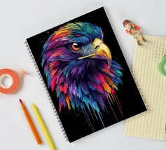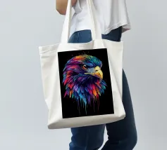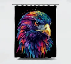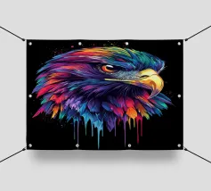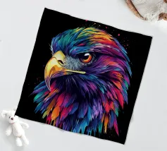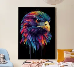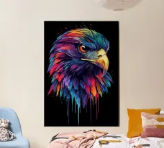Questo impressionante motivo raffigura la testa di un aquilone rosso in un'esplosiva tavolozza di colori viola, blu, rosso e giallo. Le piume dettagliate sembrano immerse in un colore liquido, che scorre dinamicamente verso il basso ai bordi. Lo sguardo penetrante del rapace, in combinazione con il becco luminoso, conferisce all'immagine un'intensità impressionante. La composizione colorata è particolarmente efficace su uno sfondo nero e crea un'impressione vivace e quasi surreale.