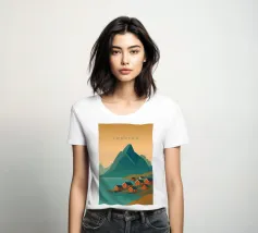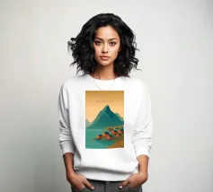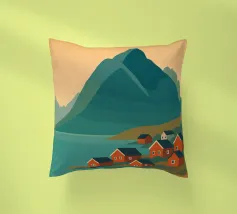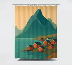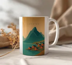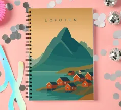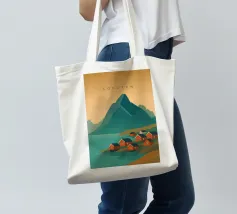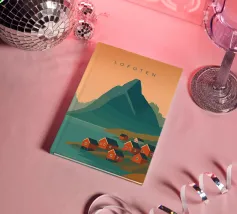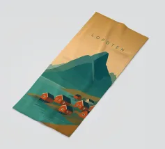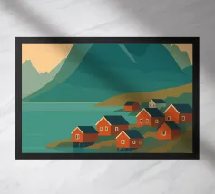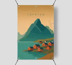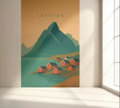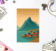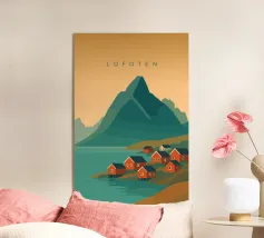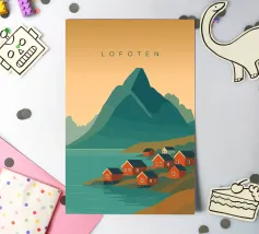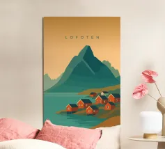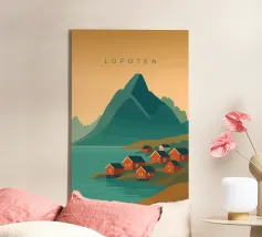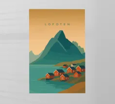 Poster di viaggio minimalista per tutti coloro che amano la piccola città di Reine, sulle isole Lofoten, con le sue iconiche montagne e i cottage rossi nel nord della Norvegia.