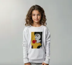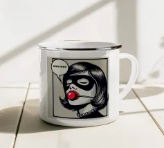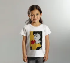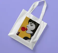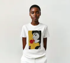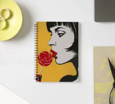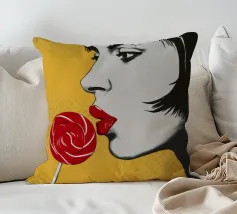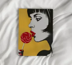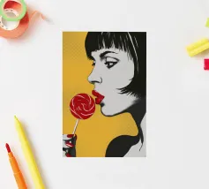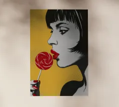 Un ritratto sorprendente di una donna con i capelli scuri, che tiene in mano un lecca-lecca rosso e guarda intensamente. Lo stile è grafico, minimalista e di ispirazione noir con uno sfondo giallo.