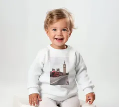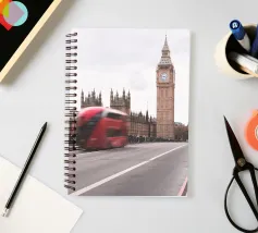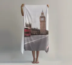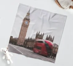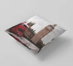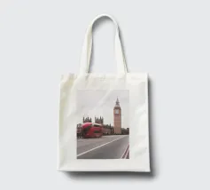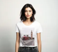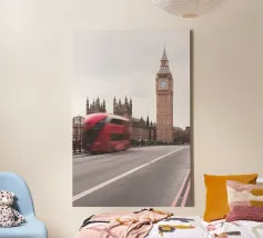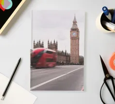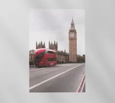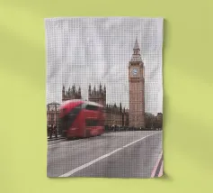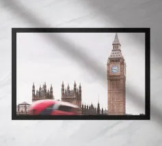 Un iconico autobus rosso di Londra in movimento sfocato attraversa il ponte di Westminster di fronte al Big Ben, sotto un cielo nuvoloso tra architettura storica ed energia urbana con un'estetica lunatica.