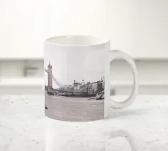 Sotto un cielo nuvoloso, il Tower Bridge, sul fiume Tamigi, circondato da edifici storici in mattoni e barche iconiche, per una vista panoramica dello skyline di Londra.