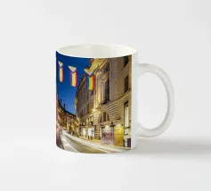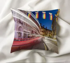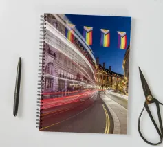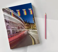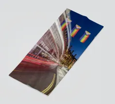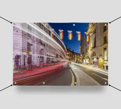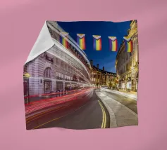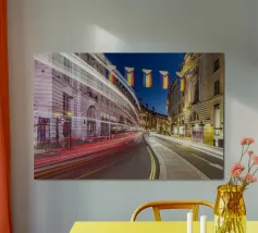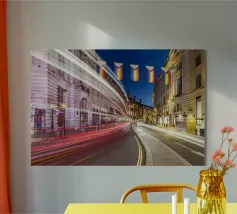 Questa scena notturna mostra la splendida curva di Regent Street nel cuore di Londra. L'architettura storica delle facciate degli edifici gregoriani è immersa in una luce calda. Le bandiere colorate del Pride sono appese sopra la strada, inviando un forte segnale di diversità e coesione. La lunga esposizione trasforma le luci dei veicoli di passaggio in scie luminose dinamiche che attraversano la curva e aggiungono movimento ed energia allo scatto. Questa fotografia combina storia architettonica, espressività sociale e pulsazione urbana.