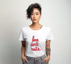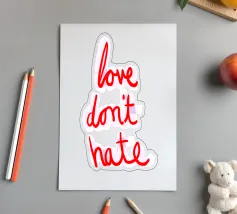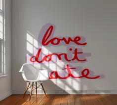 Portate un messaggio di ispirazione nella vostra casa con questo elegante poster tipografico. O altri fantastici prodotti. La scritta "Love don't hate" in rosso e rosa su sfondo bianco conferisce al design una semplice eleganza. Il bel contrasto completa perfettamente il motivo e lo rende un vero e proprio richiamo visivo.