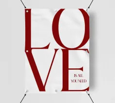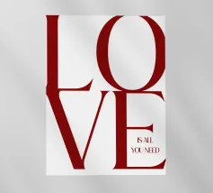 Grandi lettere rosse scrivono "LOVE" e la frase "is all you need" è scritta sotto in caratteri più piccoli. Il design minimalista utilizza uno sfondo bianco per creare un contrasto con la tipografia in grassetto.