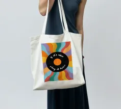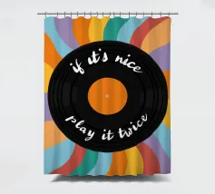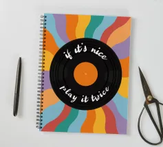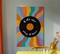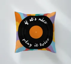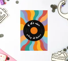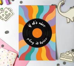 Al centro un disco nero con una calda etichetta arancione. La scritta scherzosa "if it's nice - play it twice" (se è bello, suonalo due volte) serpeggia lungo i solchi del disco, un motto che gli amanti della musica possono immediatamente condividere.