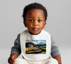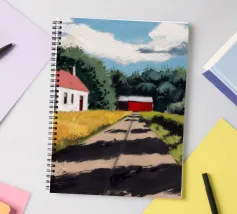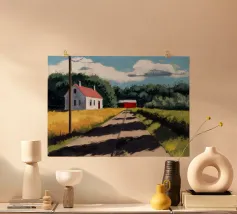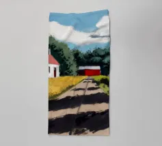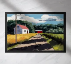 Una casa colonica e un fienile rosso sono immersi nella luce bassa di un pomeriggio invernale, con ombre lunghe che si allungano su una strada spolverata di neve, creando una scena tranquilla e rustica.