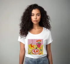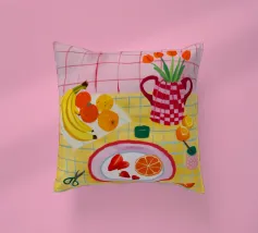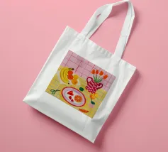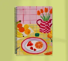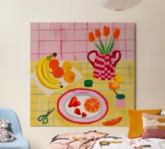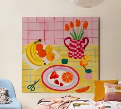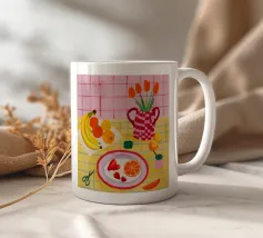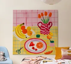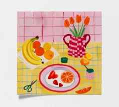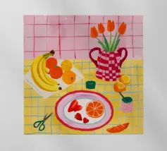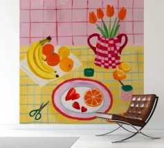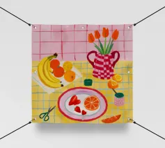 Pompelmo, banane e tulipani illuminano la tavola della colazione con colori vivaci ed energia.