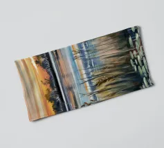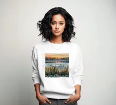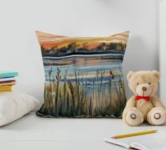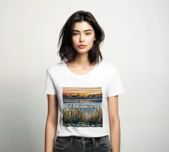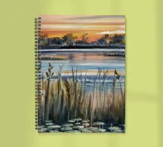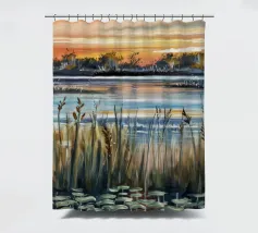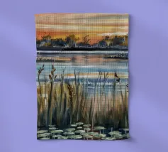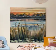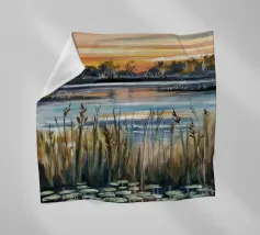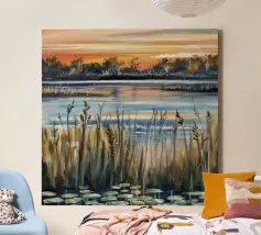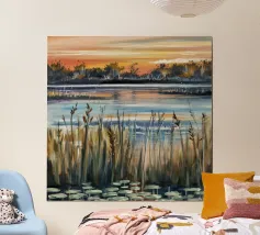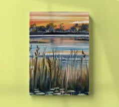 Morbide canne ondeggiano su acque piene di gigli sotto cieli dorati, formando una lirica danza naturale.