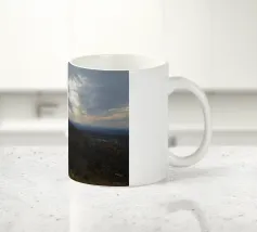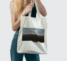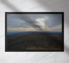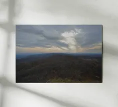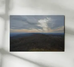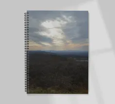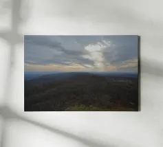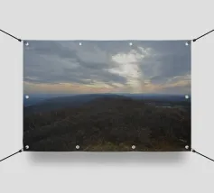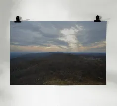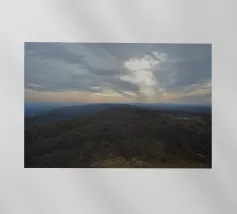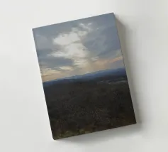 Un vasto paesaggio si estende in lontananza con dolci colline sotto un cielo per lo più nuvoloso, dove il sole irrompe, proiettando la luce sul terreno. La scena trasmette un senso di tranquillità e apertura, accentuato dai colori tenui del tardo pomeriggio o della prima serata.