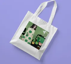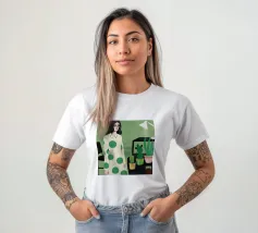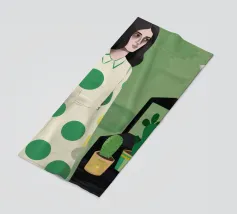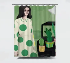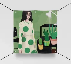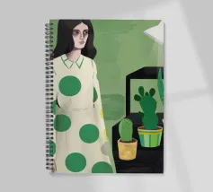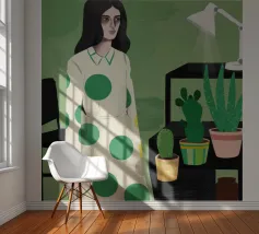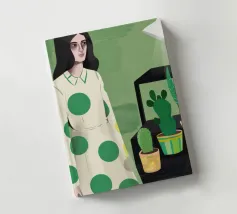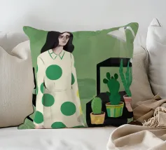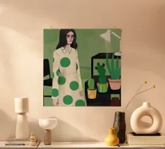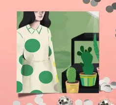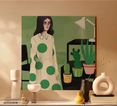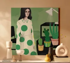 Ritratto elegante di una donna in abito verde a pois, seduta sotto il caldo bagliore di una lampada da tavolo, con cactus nelle vicinanze. La composizione è moderna e chic, con un'atmosfera tranquilla e concentrata.