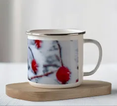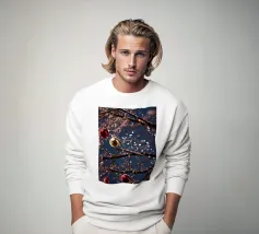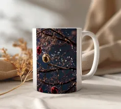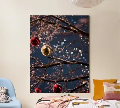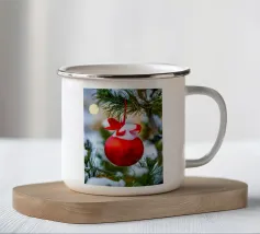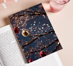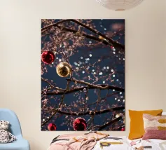 Questo suggestivo motivo mostra rami innevati decorati con scintillanti decorazioni natalizie rosse e oro. Sullo sfondo si accendono luci soffuse che creano un'atmosfera calda e festosa. Perfetto per le festività natalizie e ideale su prodotti come tazze, cuscini o opere d'arte da parete, questo disegno porterà la magia del Natale in ogni casa. Un must per gli amanti delle decorazioni festive e dei design invernali.
