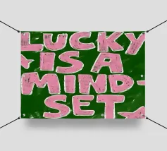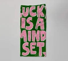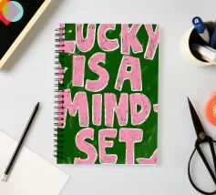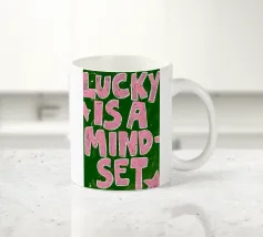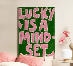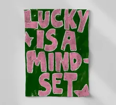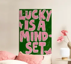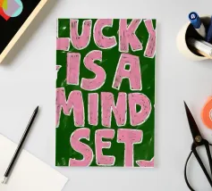 "L'affermazione 'Lucky is a Mindset' (La fortuna è un atteggiamento mentale) è scritta con caratteri in stile gessetto rosa su uno sfondo di lavagna verde, ornato da semplici illustrazioni di stelle, che trasmettono un messaggio di pensiero positivo e di fiducia in se stessi",