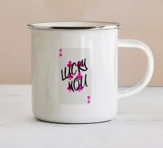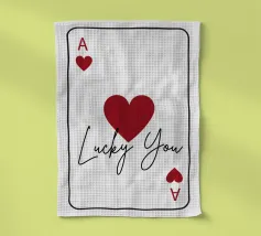 Una carta da gioco è raffigurata con il simbolo dell'Asso di cuori e la scritta "Lucky You". Il disegno combina elementi tradizionali delle carte con un messaggio giocoso.