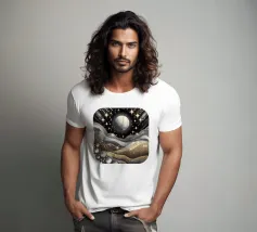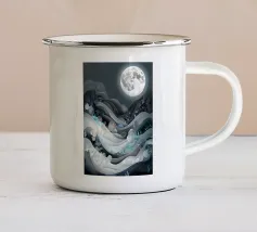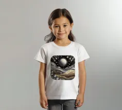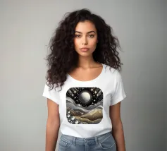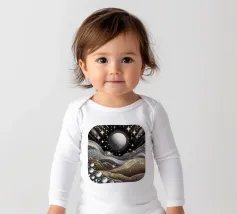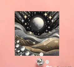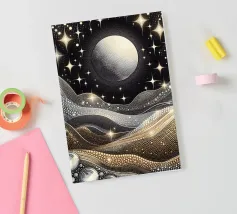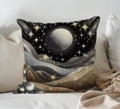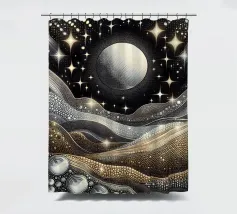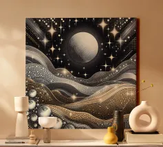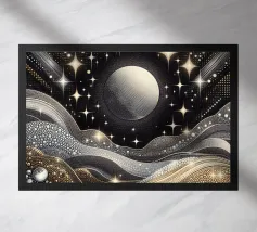 Accattivante paesaggio celeste fantasy del cielo notturno con luna e stelle splendenti e onde fluide ingioiellate con gemme e perle, con effetto metallico nei colori argento e oro, su sfondo nero.