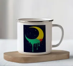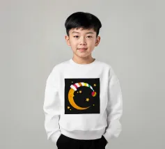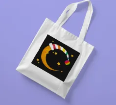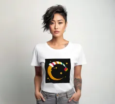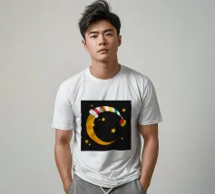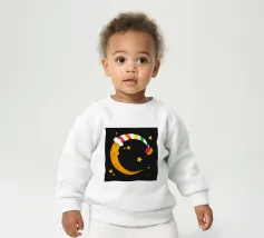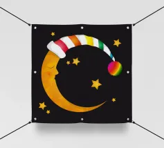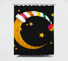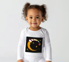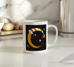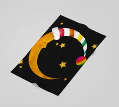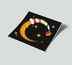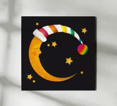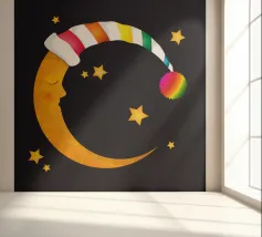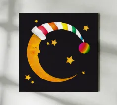 Un design da sogno: una luna pacificamente addormentata con un berretto da notte colorato e a righe, circondato da stelle splendenti. Perfetto per atmosfere accoglienti e sognanti: ideale per le camere dei bambini, per le storie notturne o come motivo calmante per i momenti di relax.