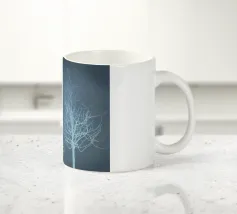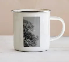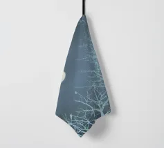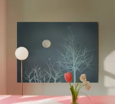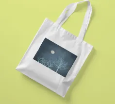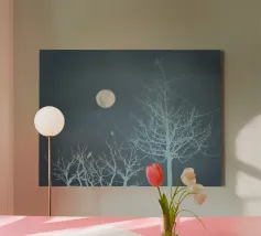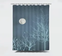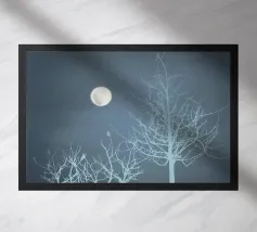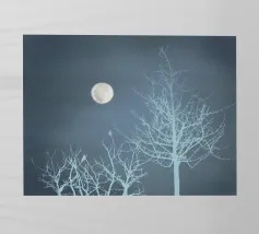Sotto un cielo notturno poco illuminato, si ergono alberi spogli, i cui rami si stagliano contro il bagliore della luna piena. La scena tranquilla evoca un'atmosfera serena e inquietante.