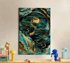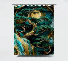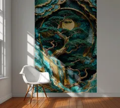Un tranquillo bonsai immerso nella luce della luna, incastonato in un sereno paesaggio da sogno Kintsugi di giada e oro, che emana calma ed eleganza naturale.