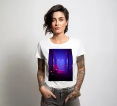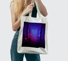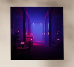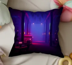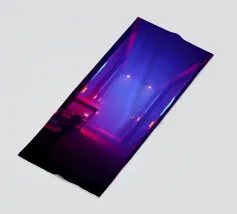 Locale vibrante, pieno di luci colorate e di nebbia, con tavoli e sedie disposti con cura per creare un'atmosfera invitante. L'ambiente è suggestivo e caratteristico.