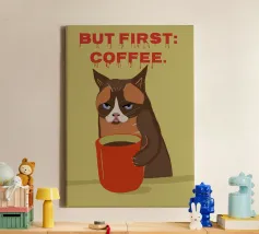 Questo gatto irascibile con una tazza di caffè troppo grande è decisamente poco reattivo e lo dimostra chiaramente. Lo slogan horror rosso sangue "Ma prima il caffè" cola su di lei come una furia liquida. Perfetto per chi ha bisogno di caffeina come prima cosa al mattino prima di interagire con l'umanità. L'umorismo nero incontra l'amore per i gatti - come poster, stampa o decorazione di Halloween.