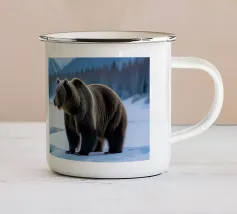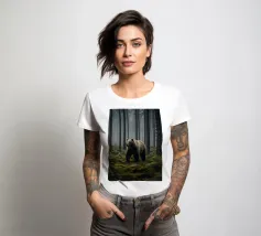 Un orso bruno cammina con sicurezza in una fitta foresta di alberi alti e muschio verde. La nebbia del primo mattino crea un'atmosfera calma e misteriosa nel bosco.
