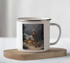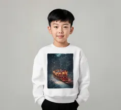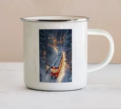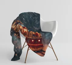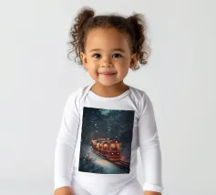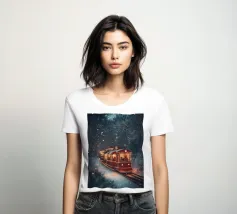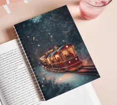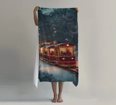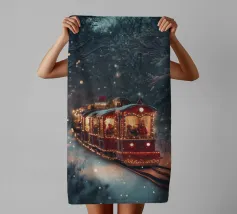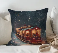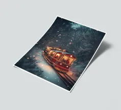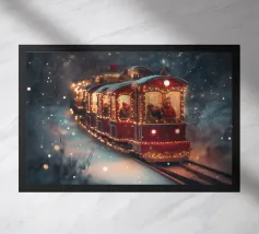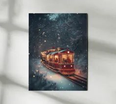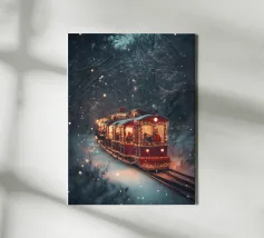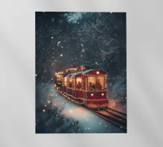 Un treno decorato a festa viaggia attraverso una foresta invernale innevata e risplende nel caldo bagliore delle luci natalizie. La scena evoca ricordi di viaggi festivi, magiche serate invernali e la gioia del periodo natalizio. Perfetto per chi vuole portare in casa propria un'atmosfera accogliente e nostalgica, un motivo pieno di calore, magia e attesa per le feste.