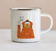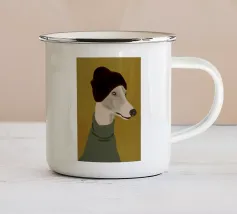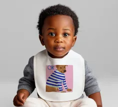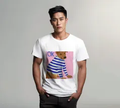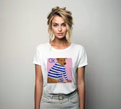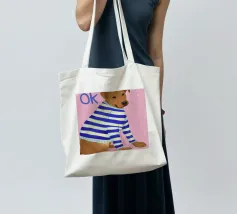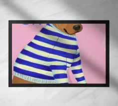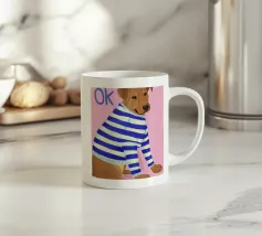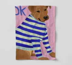 Ritratto ravvicinato di un cane che indossa un maglione a righe bianche e blu, con la parola "Ok" in una bolla sopra la testa. Lo sfondo è di un rosa vivace, che crea un personaggio canino giocoso e affascinante.