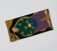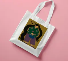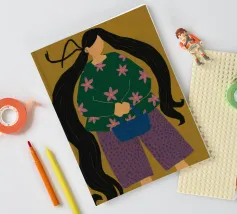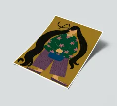 Ritratto di donna con capelli lunghi e scuri che indossa un maglione verde con motivo a stelle. La sua posa è serena e soddisfatta, creando una bella immagine di tranquillo, confortevole ed elegante possesso di sé.