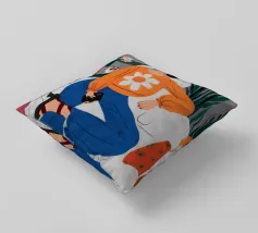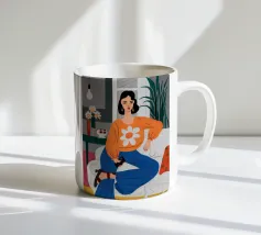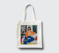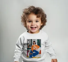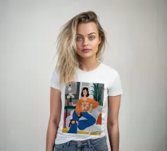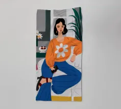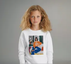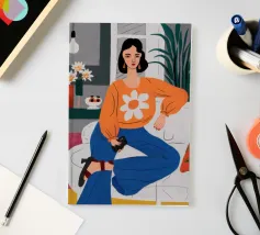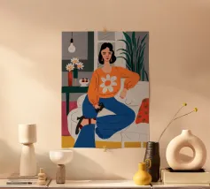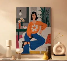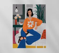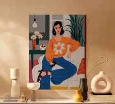 Ritratto di una donna elegante con un accogliente maglione arancione con motivo di margherite. La sua posa sicura e il design semplice e allegro creano un'immagine moderna, calda e senza sforzo.