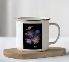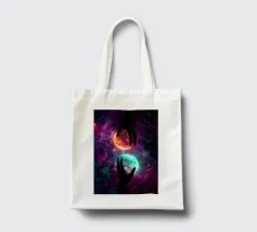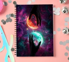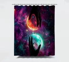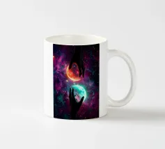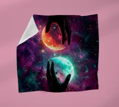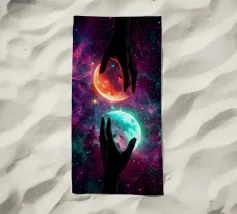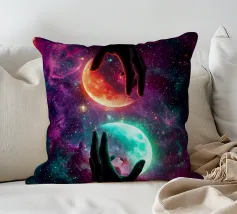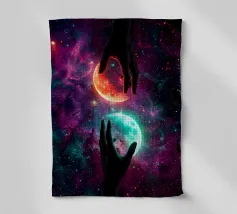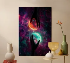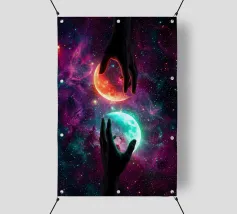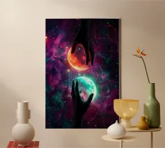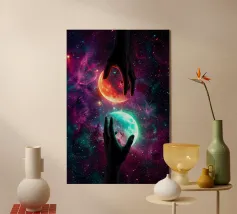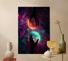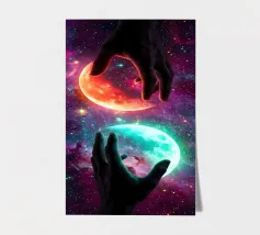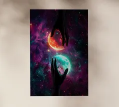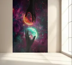 Questa ipnotica opera d'arte surreale raffigura due mani umane che si protendono attraverso una galassia vibrante, tenendo delicatamente due lune gemelle incandescenti sospese nello spazio cosmico. Ricca di colori nebulari, di profondità stellare e di luci drammatiche, la scena simboleggia l'equilibrio, la connessione e il controllo dell'universo. Il contrasto tra i toni caldi e freddi dei pianeti crea una potente armonia visiva, che fonde fantasia, spiritualità e fantascienza. Perfetto per gli amanti dell'arte cosmica, del simbolismo astratto e della decorazione murale moderna, questo disegno aggiunge energia, immaginazione e un'audace dichiarazione celeste a qualsiasi ambiente.