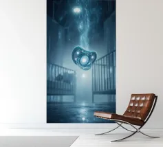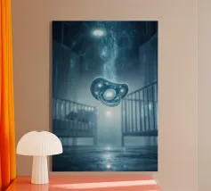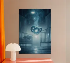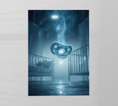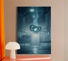 Quest'opera d'arte mette in scena un manichino luminoso e fluttuante in un inquietante ambiente blu che ricorda un ospedale o un'istituzione. I raggi di luce e le energie appaiono quasi soprannaturali, conferendo al motivo un effetto mistico, quasi extraterrestre. Un affascinante gioco di simbolismi, tecnologia e innocenza. Particolarmente adatto agli appassionati di fantascienza, agli amanti della concept art o a chiunque apprezzi i motivi surreali con un forte carattere simbolico.