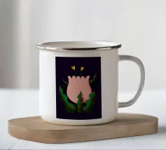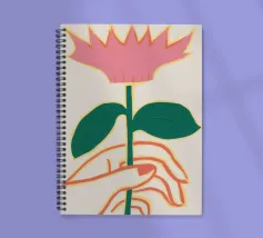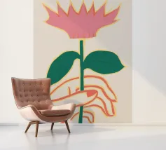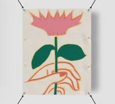 Illustrazione minimalista di due mani che tengono delicatamente il gambo di un grande e singolare fiore rosa. L'immagine trasmette un senso di cura, fragilità e bellezza.