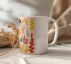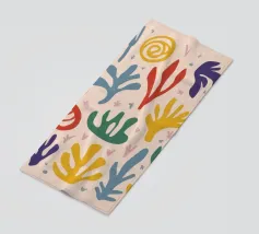 Una vibrante e gioiosa composizione astratta di foglie colorate e forme organiche nello stile dei ritagli di Henri Maraoui. La composizione è dinamica e piena di vita.