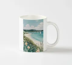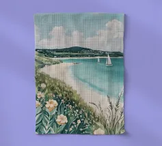 Una serena scena costiera con acque turchesi, fiori in fiore e barche a vela. Perfetto per aggiungere pace e fascino a qualsiasi spazio.