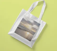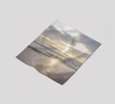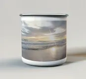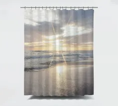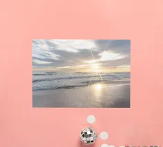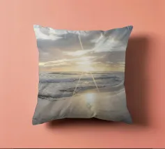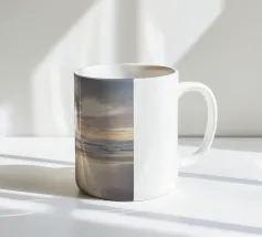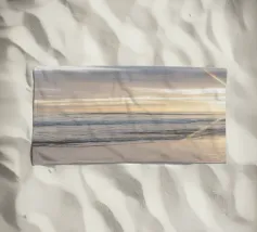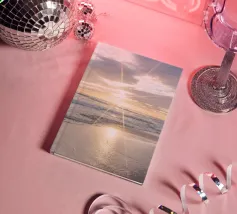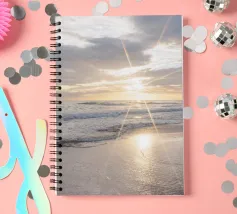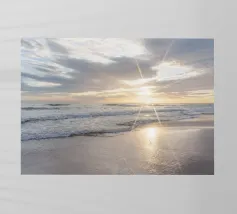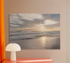 Un paesaggio marino da sogno in cui le onde morbide incontrano il caldo bagliore di un'alba dorata. La delicata esplosione di stelle e i sottili riflessi sulla sabbia creano un'atmosfera tranquilla e ariosa che invita alla calma e alla chiarezza.