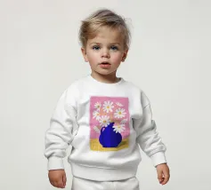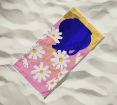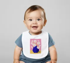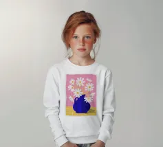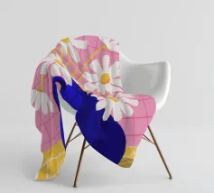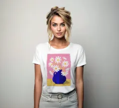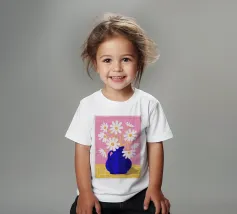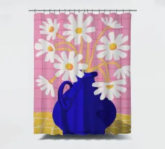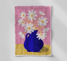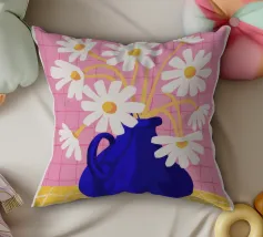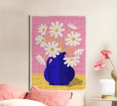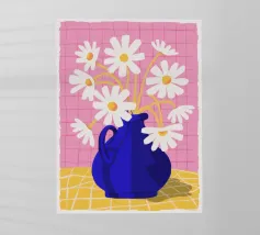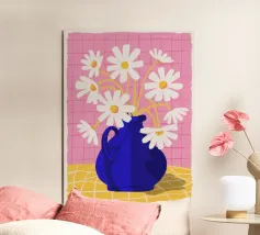 Margherite bianche sbocciano in una brocca blu su una parete a scacchi rosa tenue, emanando una gioia serena.