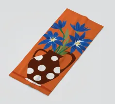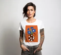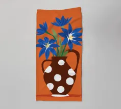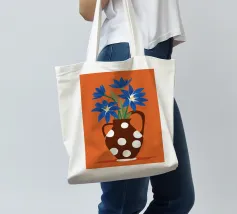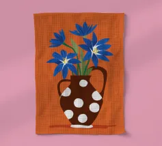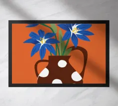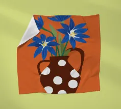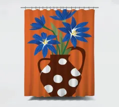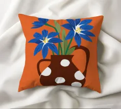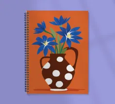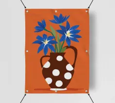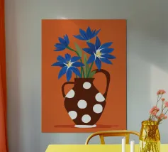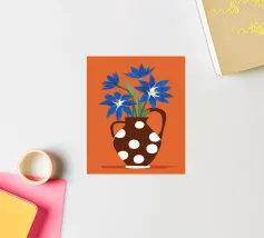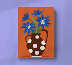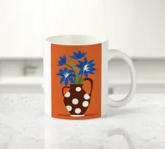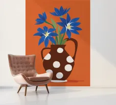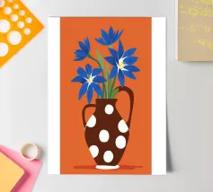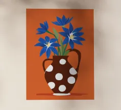 Un'affascinante natura morta presenta un bouquet di margherite blu in un vaso marrone ornato da pois bianchi, creando un'illustrazione floreale semplice, rustica e allegra.