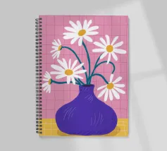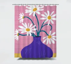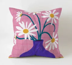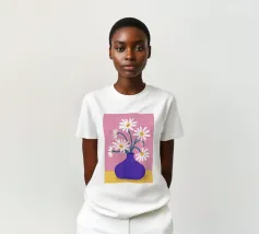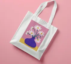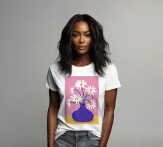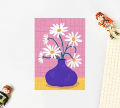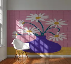 Una semplice e bellissima natura morta di un bouquet di margherite bianche in un audace vaso viola. Lo sfondo rosa e la composizione minimalista creano un'opera d'arte floreale moderna, fresca e affascinante.