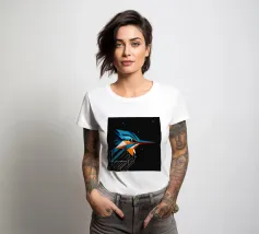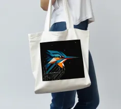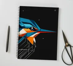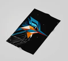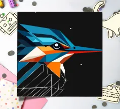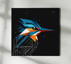 Un martin pescatore stilizzato in un disegno geometrico, che risplende nei toni del blu e dell'arancio contro un cielo notturno scuro. Perfetto per gli amanti della natura e dell'arte moderna, questo disegno combina l'eleganza del martin pescatore con l'estetica moderna delle forme geometriche.