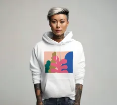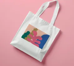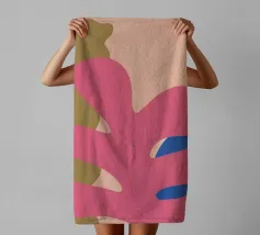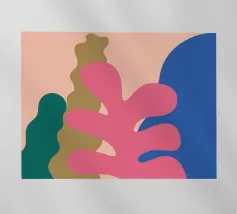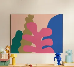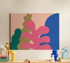 Un paesaggio astratto di grandi forme arrotondate, simili a massi, in una piacevole tavolozza di rosa, verde e blu, che crea una composizione semplice, moderna e armoniosa di forme e colori.