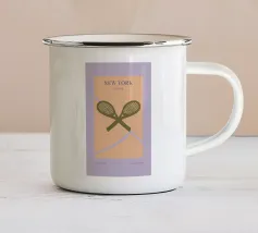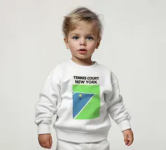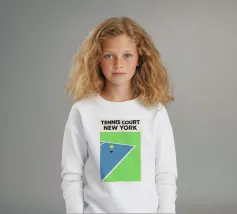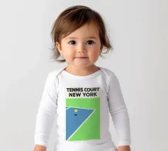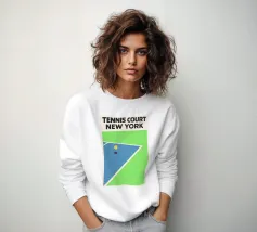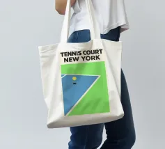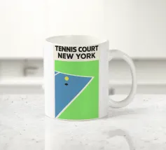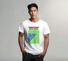 Design moderno e retrò di un campo da tennis con colori vivaci e un'estetica minimalista. Questo poster mostra una pallina da tennis stilizzata su un campo blu pastello su uno sfondo rosa, ispirato all'energia urbana di New York. Perfetto per gli appassionati di sport, gli amanti del design e i fan dell'arte geometrica. Stampa di alta qualità per la casa o l'ufficio, per uno stile sportivo e urbano.