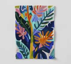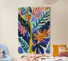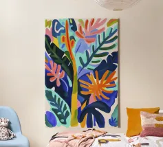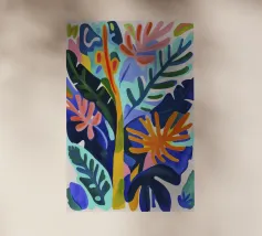 L'allegria tropicale incontra l'estro moderno in questo audace e colorato disegno di fogliame floreale ispirato allo spirito espressivo di Henri Matisse. Con le sue forme vibranti e la sua energia artistica, dà un tocco giocoso e creativo a qualsiasi cosa, dall'arte da parete all'arredamento per la casa e agli accessori di uso quotidiano.