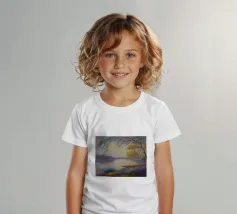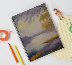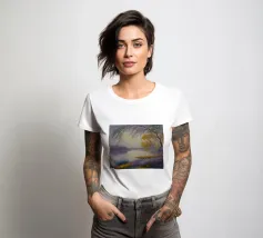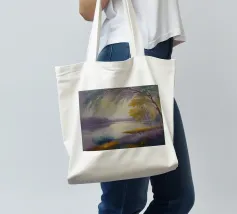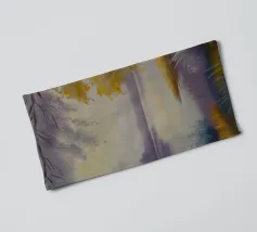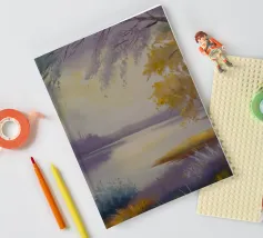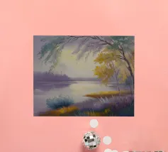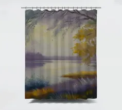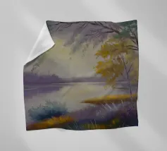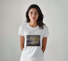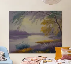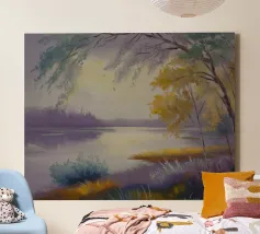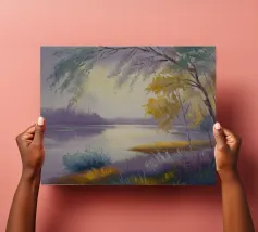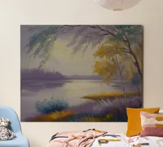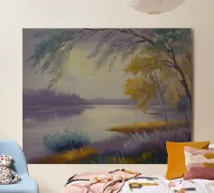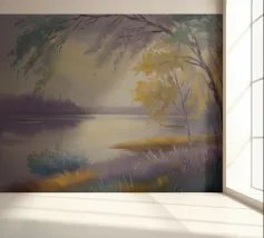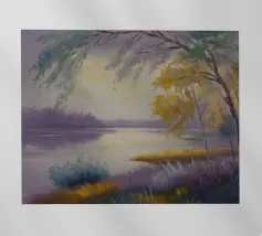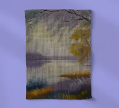 Un dipinto paesaggistico di un lago avvolto nella nebbia, con un albero sulla riva vicina e le rive lontane e nebulose. I colori sono tenui e sfumati, evocando una mattina tranquilla.