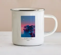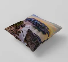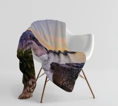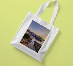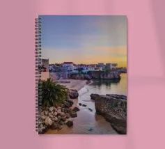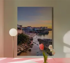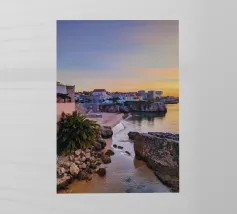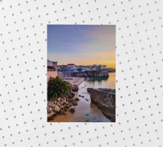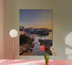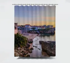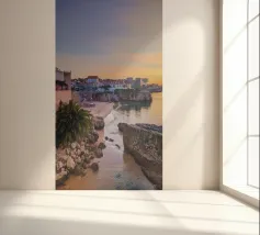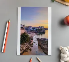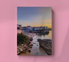 Questa immagine cattura una veduta mattutina di Cascais, una città costiera sul confine occidentale del Portogallo, appena fuori Lisbona. Le morbide sfumature rosa e arancioni dell'alba si riflettono sulle calme acque dell'Atlantico, proiettando una calda luce sulla spiaggia sabbiosa e sul litorale frastagliato. Le tradizionali case basse con tetti in terracotta siedono tranquillamente sopra le scogliere, incorniciate da palme e formazioni rocciose naturali.