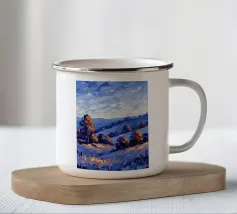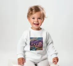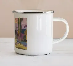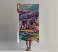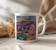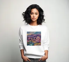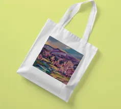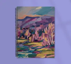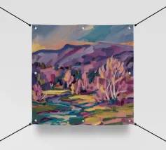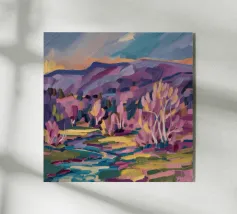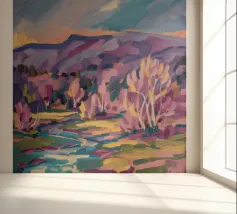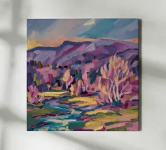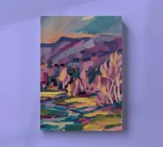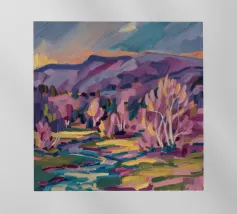 Un dipinto paesaggistico espressivo raffigura un fiume che serpeggia in una valle con alberi dalle tonalità autunnali o crepuscolari di rosa, arancione e viola, sotto un cielo drammatico e colorato, che evoca una scena lunatica e vibrante.