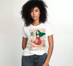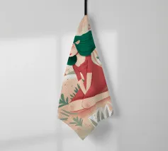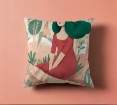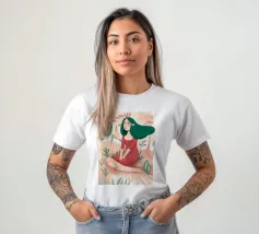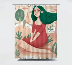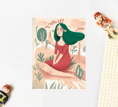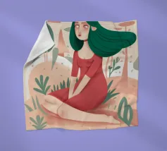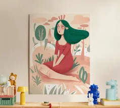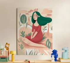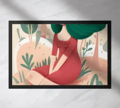 Questa opera d'arte raffigura una figura seduta in un giardino circondato da piante e alberi. La figura indossa un abito rosso e la scena evoca un senso di tranquillità e meditazione.