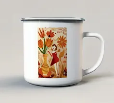 Questa opera d'arte raffigura una figura seduta in un giardino circondato da piante e alberi. La figura indossa un abito rosso e la scena evoca un senso di tranquillità e meditazione.