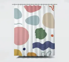 Una composizione minimalista di varie forme organiche e geometriche in una tavolozza di colori tenui e piacevoli di blu, verde, rosa e terracotta su uno sfondo chiaro.