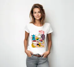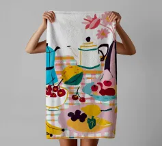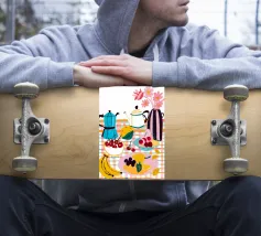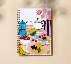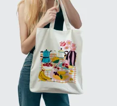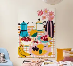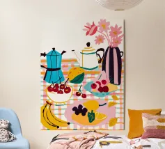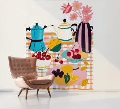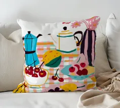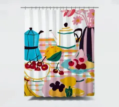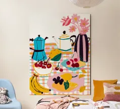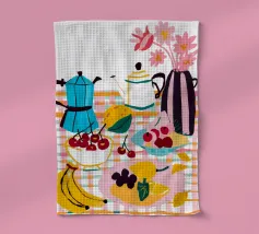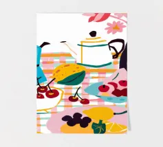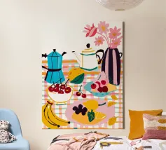 Un'affascinante natura morta di un classico miscuglio per la colazione, che comprende una caffettiera, una tazza di caffè, ciliegie e una banana. La composizione è un'ode colorata, equilibrata e deliziosa al pasto mattutino.